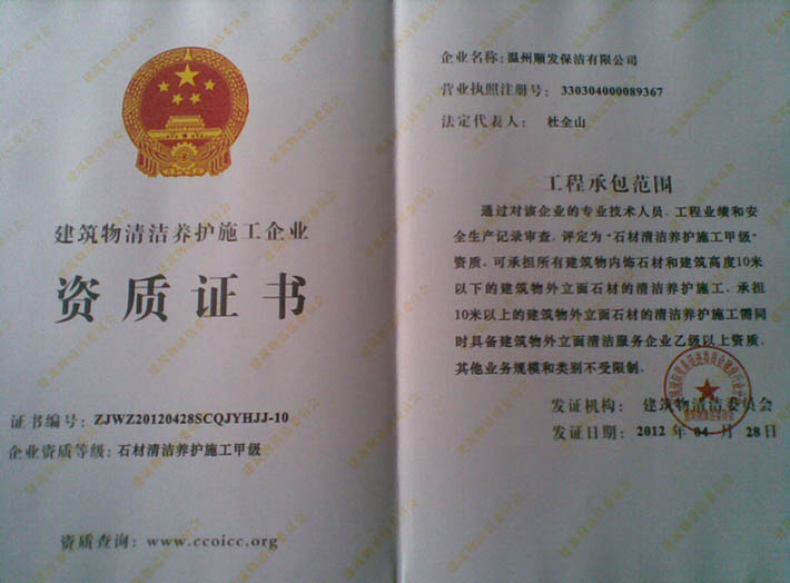 石材養(yǎng)護施工資質(zhì)甲級證書